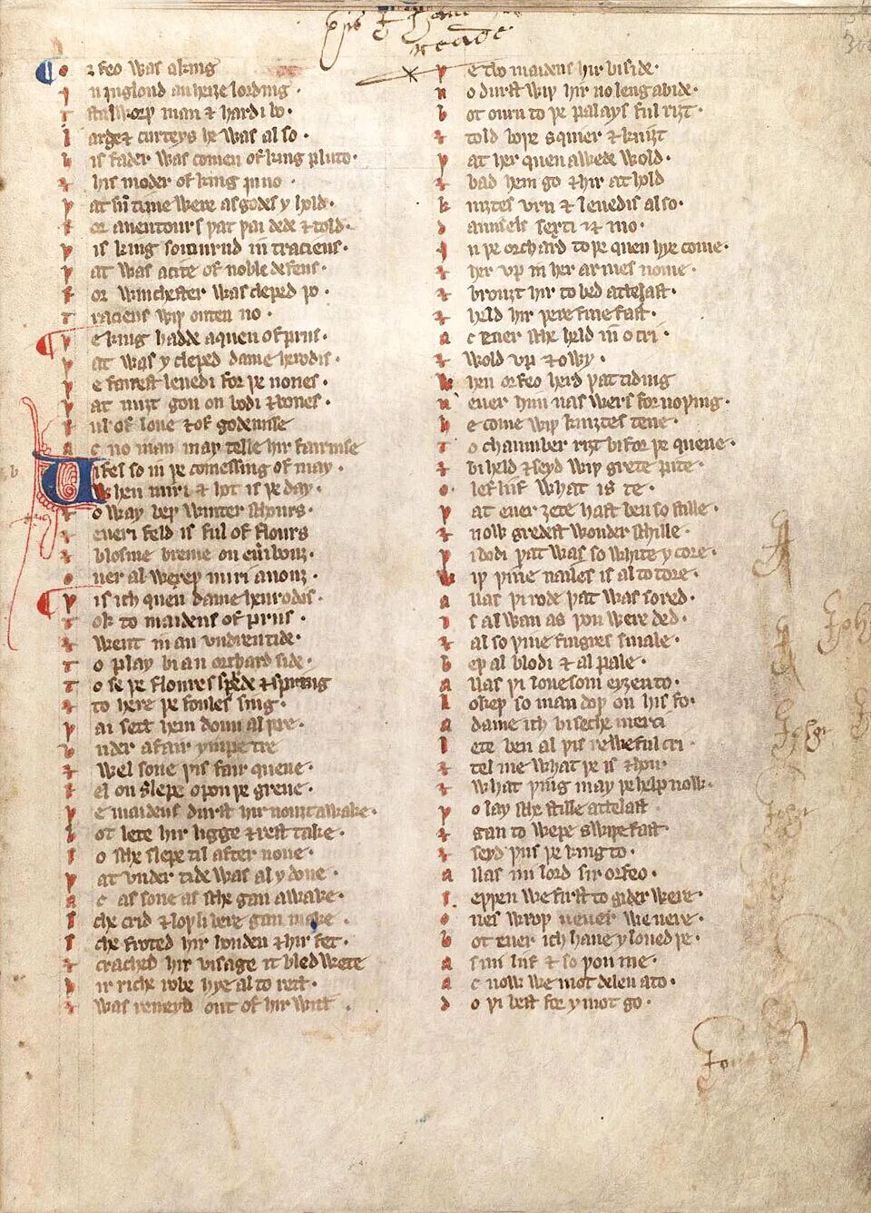 不过,俄耳甫斯毕竟是国王而不是目不识丁的贫民,他间或用到的法语词往往成为一种身份标记。他动辄发着“是啊!”(Parfay)的感叹,这个感叹词源自诺曼宫廷,最初是宣誓词,字面意义是“为了信仰”(par foi)。在俄耳甫斯衣衫褴褛地归来,假扮成一位穷困潦倒的吟游诗人,祈求他的大臣怜悯、接纳他时,他说:“怜悯我吧!我是一位来自异教土地的竖琴师,帮我度过这难关吧!”我们很难想象,那个年代未接触过上层文化、不识字的英国贫民会在日常语中使用到困苦、难关(destresse)这样的书面语词。此前,俄耳甫斯在异界面见国王时,更是使用拉丁语/法语的proferi(带来)来替代英语的bryng。