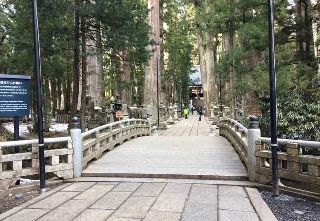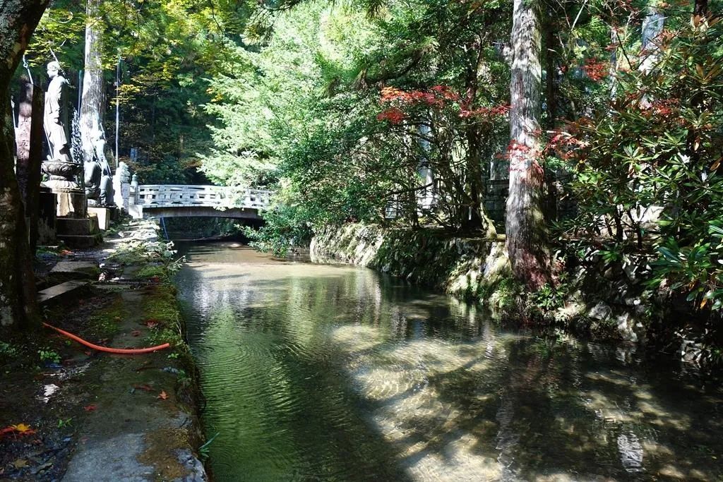 玉川这条河的对岸禁止拍照。我满心遗憾地看着表明此意的告示牌,因为河对岸是奥之院到目前为止最美的所在。出于某些无法立刻想明白的原因,我最想拍摄的就是桥那边的一座凉亭形状的坟墓。坟墓的石质地面刚被扫过,石台阶上的围栏旁还斜倚着一把和尚的笤帚。