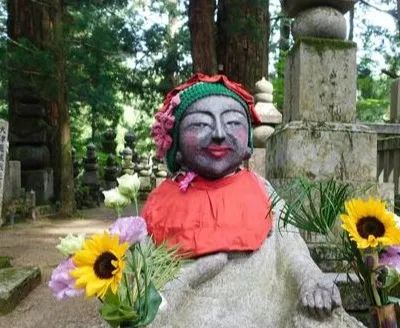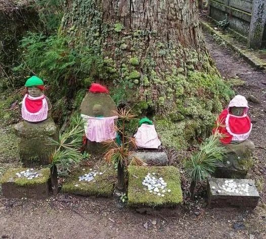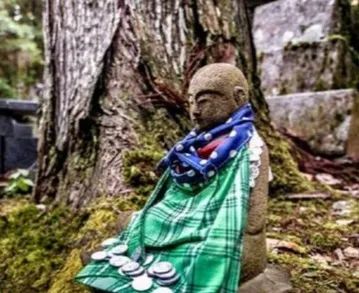 地藏是指那些坐在那儿、微寐、守着墓园的小(不过一英尺高)石佛一样的神灵。在很多传统宗教圣地的日式花园和空地里的地藏都是如此。在奥之院,人们往小地藏的脖子周围系上有颜色的小围兜。还有几个戴着帽子。这些“娃娃装”看起来簇新,都不超过一年。照我看大多数是几个月前更换的,因为衣物在奥之院这么潮湿的地方应该会腐坏得很快。