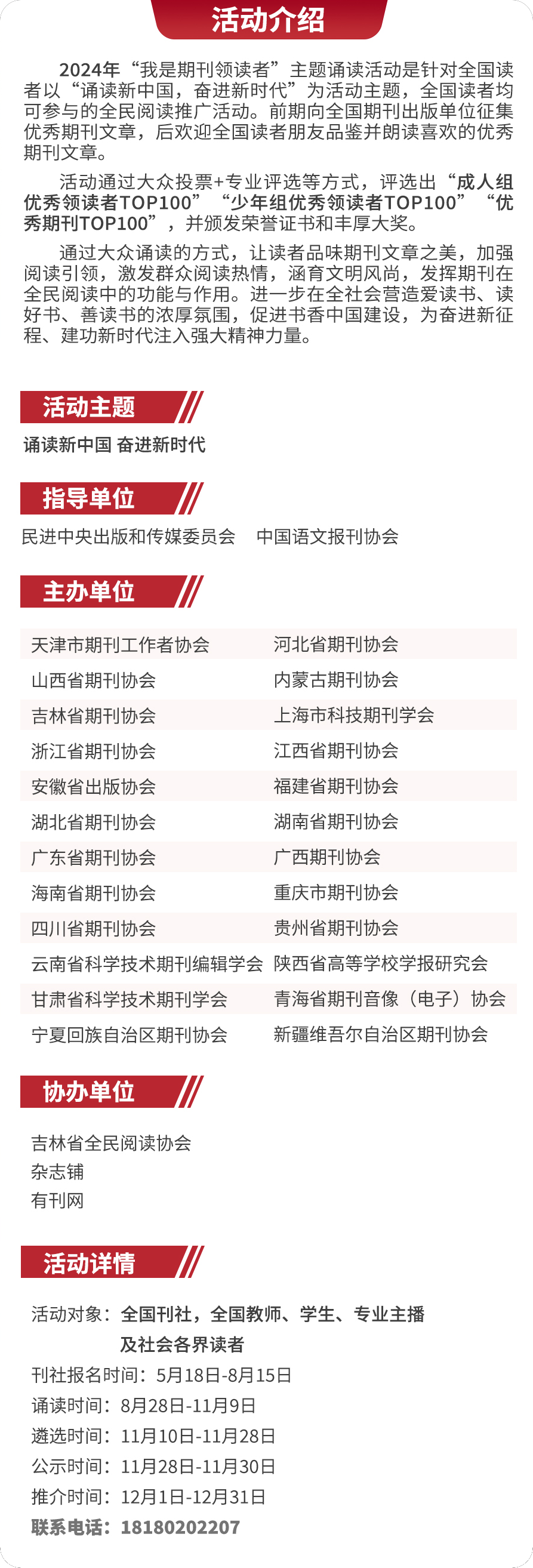 天津市期刊工作者协会、吉林省期刊协会等全国24家省、市、区期刊协会联合举办的2024年“我是期刊领读者”主题诵读活动大众诵读正式启动!