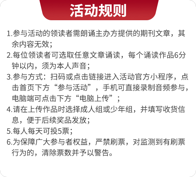 活动面向全国大众,为新时代新征程献声!诚邀您参与诵读优秀期刊文章,一同诵读新中国,奋进新时代!
