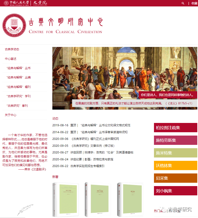 编者按:在中国人民大学文学院的支持下,“古典文明研究中心”官网于近日全新升级,正式上线!新增多个相关栏目,内容更丰富,信息更全面,功能更完善。关心中国古典学发展态势的读者可以密切关注“古典文明研究中心”的官网信息发布,相信会有更多的惊喜和收获。