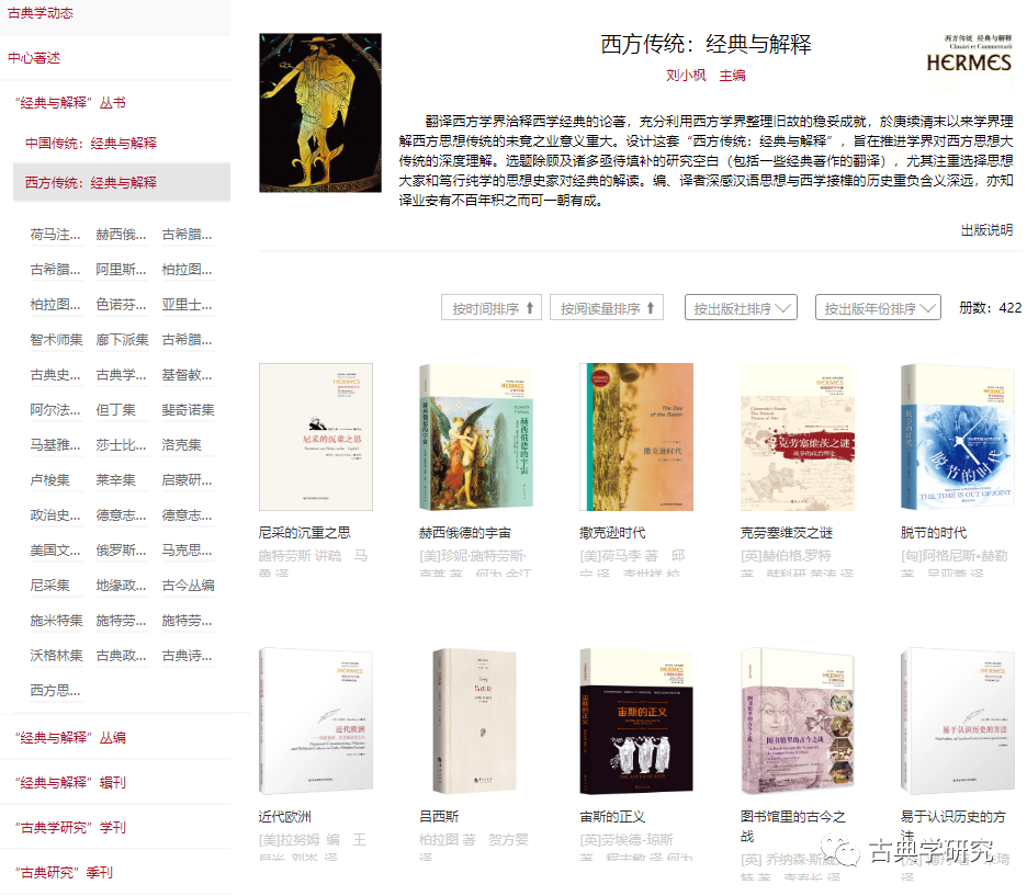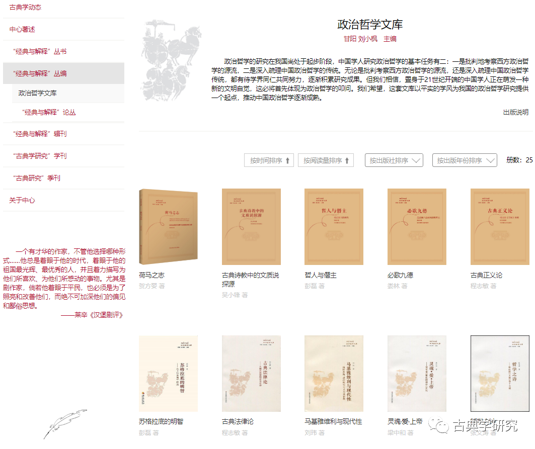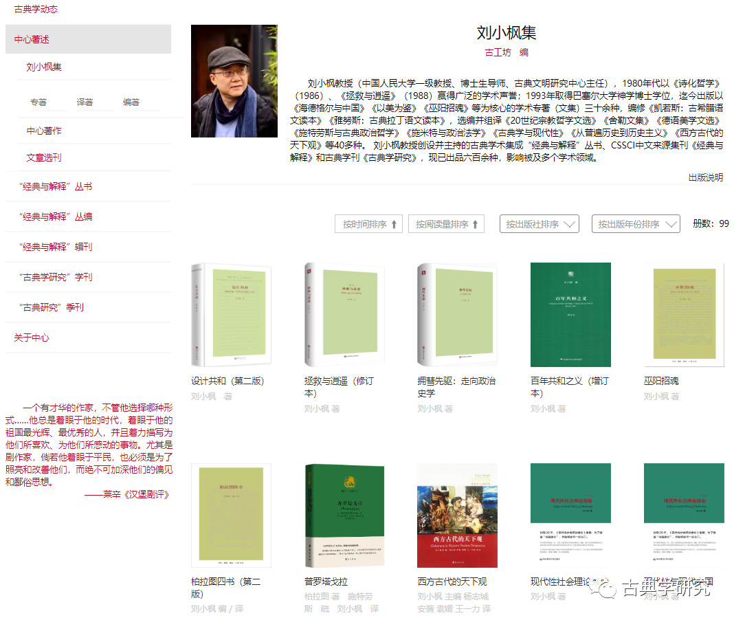 其中,刘小枫集又分三个子栏目,分别介绍中国人民大学一级教授、古典文明中心主任刘小枫教授的专著、译著与编著。