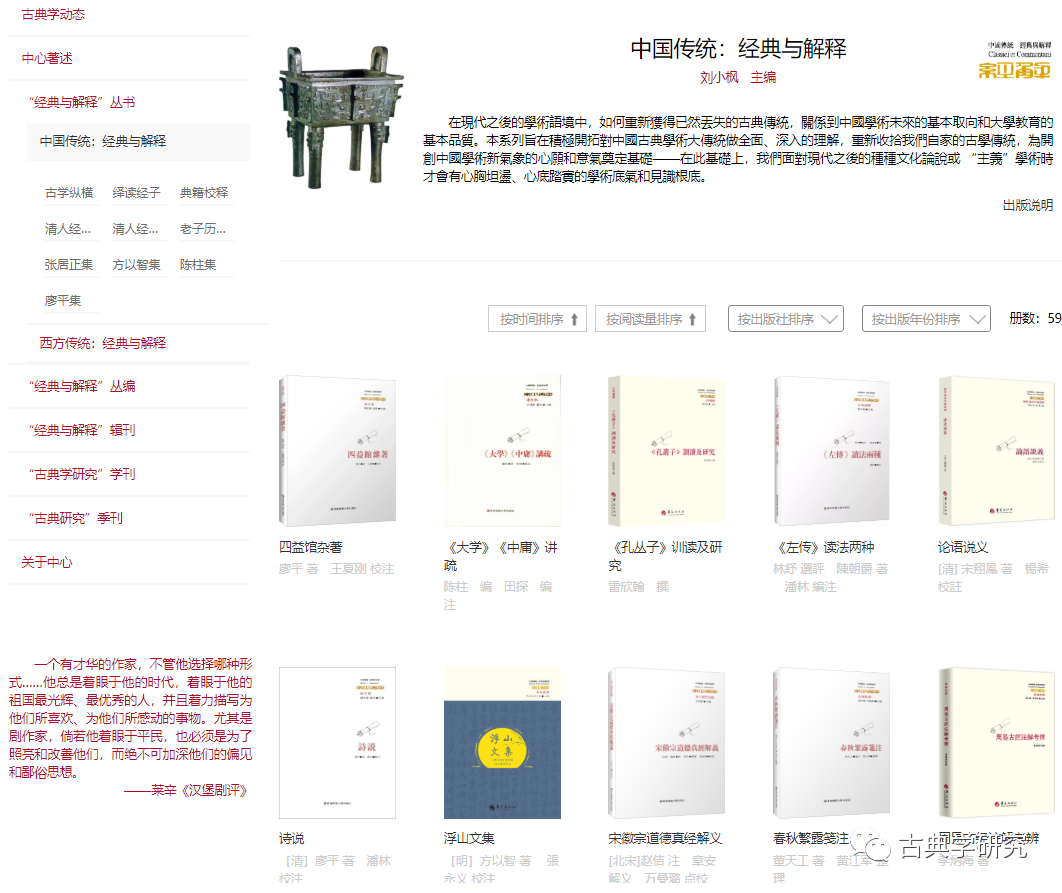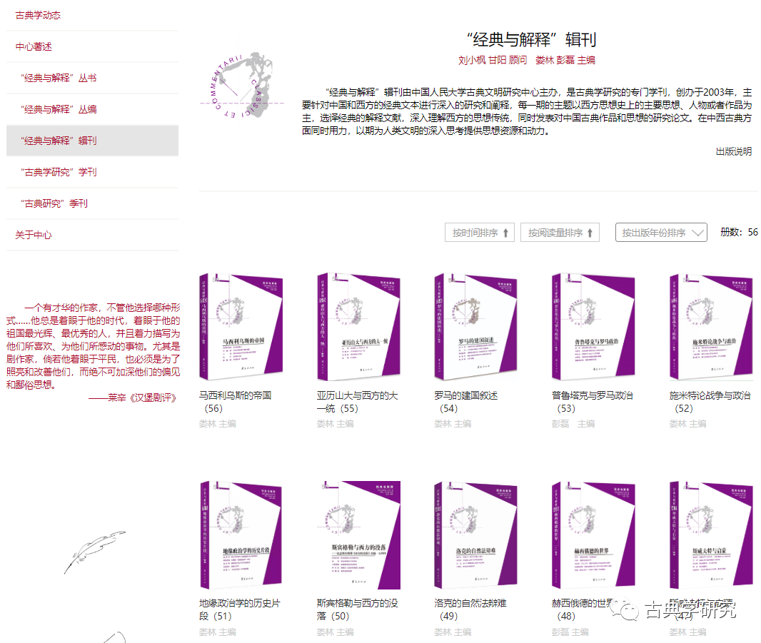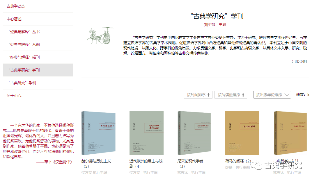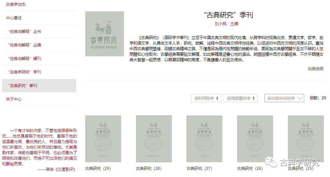 中心著作则展示古典中心其他学人的学术成果,文章选刊包括中心学人及在读博士的学术论文。