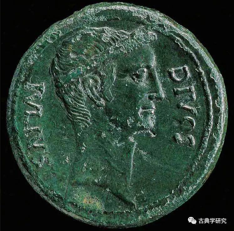 当屋大维在公元前44年正式登上历史舞台时,与凯撒之间的血缘之亲几乎是他唯一的政治资本。[3] 屋大维成为“神子”几乎没有争议,他自一开始就以盖乌斯·凯撒自称(而极少用屋大维这个姓氏);而凯撒在生前已经以神灵自居。尽管凯撒在东方并未收受过和其敌手庞培那样多的神圣荣誉,但几乎可以肯定他在比叙尼亚国王尼科米底斯宫廷和在埃及与克莱奥帕特拉女王共处的经历,让他见识到了东方神-王的权力本性。因此当他在公元前45年从东方返回罗马时,谄媚的元老院颁布了一系列法令,使其不仅得以与诸神共享神庙,也让凯撒的称神之心昭彰于世。[4] 而随着他在次年(公元前44年)匆忙离世,“神圣的尤里乌斯”成为了更加确定无疑的事实。[5] 从公元前42年开始,尤里乌斯·凯撒被正式纳入国家祭仪体系之中,在所有意大利城邦中接受敬拜。[6] 随后屋大维在钱币上的称号(“共和国三人执政”)中加入了“神之子”(divi filius)。最后他干脆放弃了“三人执政”字样,改将“统领凯撒,神灵之子”(imperator Caesar divi filius)作为唯一头衔。[7] 但这还只是个开端,“神之子”自此开始密集出现在奥古斯都的自我呈现之中,成为伴随其一生的重要符号。▲ 雕刻有“DIVUS IULIUS”(“神圣的尤里乌斯”)及年轻时凯撒形象的钱币