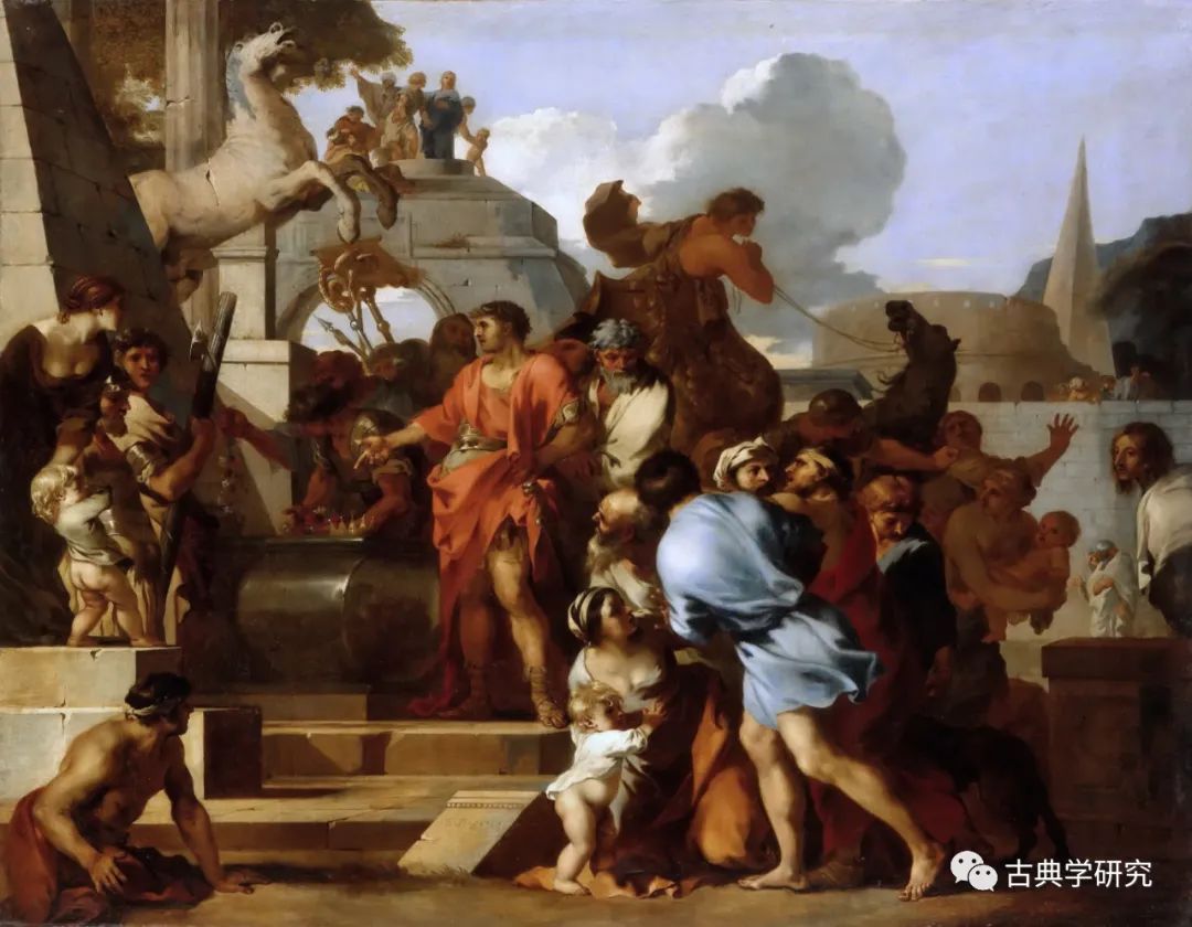 公元前17年,奥古斯都决心恢复世纪竞技赛。自布匿战争胜利以来,这还是该竞技赛百年以来的首次复兴。[44] 就赛事本身的性质而言,这是对一个全新时代的庆祝。自公元前44年的彗星事件、西比尔预言以及维吉尔歌唱“黄金时代”以来,一种新时代的气氛就已经开始酝酿。[45] 其中最引人注目的特点之一在于,阿波罗神在赛事中受到了前所未有的关注。[46]这场原本在夜间举办的仪式被改成日夜交替的模式,而白天祭祀的神灵除了朱庇特和朱诺两位主神之外,还有太阳神阿波罗。[47]维吉尔已于两年前去世,年轻的诗人贺拉斯奉命为这场竞技赛创作《世纪颂歌》(Carmen Saeculare),在开头即揭示了赞美的对象:“福波斯和森林神狄安娜……你们应当受敬拜”(l.1-4)。这首颂歌将在赛事的最后一天被两次传颂,除了在卡皮托利山上的朱庇特神庙前,另一次就在帕拉丁山上的阿波罗神庙前。[48]此前唯一一座阿波罗神庙,是尤利乌斯家族的一位执政官(Gaius Iulius Mento)在公元前5世纪的灾疫中修建给医神阿波罗的。[49]由于是来自异邦的神灵,这座神庙建于罗马神圣的城界之外。因此直到屋大维决心在帕拉丁山上为阿波罗神修建神庙之前,这位神灵从未真正进入“城界”之内。神庙的选址同样具有传奇的色彩:据说是一道闪电击中了奥古斯都原本修建于帕拉丁山上的府邸,此地因而被认为是由阿波罗所选定的神圣之地。[50]奥古斯都本人的住宅随后也建在了这座神庙之侧,仿佛是神庙的一座侧室:这在字面意义上赋予了奥古斯都一种“与神灵共享神庙”(συνναος θεος)的身份。尽管这在希腊化时期的王权传统中并非没有先例,但以在世之身“坐落于”神庙之中,即便在希腊世界也并不常见。[51]在贺拉斯四年后(公元前13年)献给屋大维的《颂诗》(Ode 4.14)中,他称后者为“太阳照耀的可居住之地/这至高无上的首领”(4.14.5-6)。[52]“太阳”与“首领”在此处的并置不容小觑。这一类比并不完全因为“太阳所照耀之处”可用于表述罗马在“整个世界上”的统治范围,而且在于首领具有某种“永恒不朽的美德”(4.14.3)可与太阳相比拟,使其具有创造新的“黄金时代”的潜能。尽管这样的美德在贺拉斯的语境中可能不止一个,但在奥古斯都时期所宣扬的新时代美德中仍有一项非同寻常,“和睦”(concordia)。它在希腊语中对应概念(homonoia)的重要性,已经从自亚历山大俄匹斯之祷以来的希腊经验中得到了印证,与“太阳之子”统治下的“黄金时代”的关联也显然为公元前1世纪的罗马人所知。在奥古斯都时期,“和睦”概念的复兴伴随着阿波罗文化的兴起,无论如何都不可能是一种偶然。▲ 亚历山大墓前的奥古斯都,塞巴斯蒂安·波登 绘