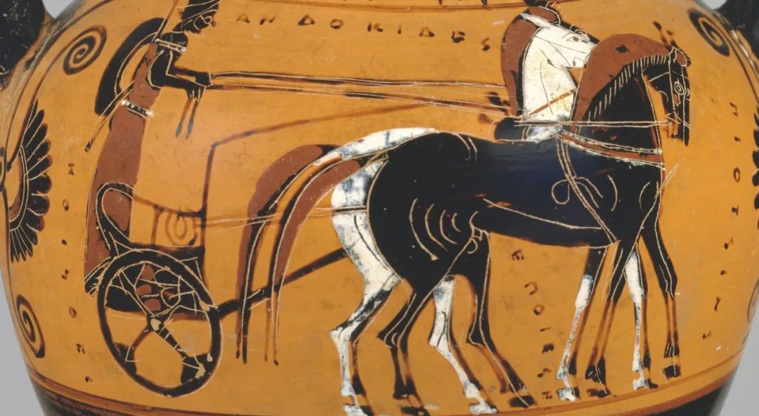 这样,无论是那些理念本身,还是那些把所分有的理念作为本质属性的事物,都不能接受自身的“相反者”。因此,理念本身与把所分有的理念作为本质属性的事物在不能接受“相反者”这点上也构成了一种一致性。这种一致性成为我们的思想既安全又巧妙的基础。热的东西是因为热本身,这当然是安全的;热的东西是因为火,这个说法之所以成立且更巧妙,是因为热构成火的本质属性,火在本性上就不能容纳相反的属性冷。现在我们可以尝试进一步回答前面提出的问题:苏格拉底为何说用感觉来把握事物的原因会使我们的灵魂变盲?苏格拉底的意思显然不仅是阳光太刺眼或者声音太大会损害感觉器官。因为,如果是这个原因,我们完全可以用人为手段避免外界物体对我们感官的伤害。通过探究原因的“第二次起航”对理念因的引进,苏格拉底不但为我们的思想提供了一种对原因“安全却愚蠢”的回答,还提供了另一种更巧妙的回答,根本原因就是理念本身提供了它与分有它并把它作为本质特征的事物之间的一种一致性。柏拉图把这种一致性看作原因与结果之间的一种因果性。而感觉恰恰无法提供这种一致性,无法提供原因与结果之间的那种因果一致性,只能发现一些辅因,这些辅因会带来一种原因与结果之间的“多”或者自相矛盾。“一”对于“多”的这种优先性,不仅是存在论上的,也体现在我们的思想中。我们的思想优先于感觉的一个根本原因就在于,前者能够建立起原因与结果之间的因果性,后者则不能。这种因果性如果首先是原因与结果的某种一致性,那么就像柏拉图所展示的那样,我们的思想就会是安全的,也会更加巧妙。理念为我们的思想提供的这种安全感的本质,以及“一”对于“多”的优先性,我们还很少深入去思考。像尼采说过的那样,我们的理性本质上不过是一种“最富精神性的权力意志”。事实上,在后来的哲学思想中,我们还是能够在关于“感性杂多”“知性是一种规则的能力”等论述中,听到苏格拉底哲学的某种模糊而遥远的回声。▲ 古希腊瓶画:“我们的车夫驾驭着两匹马,一匹高贵美好,出自同样的血统,另一匹完全相反,血统也相反。”苏格拉底说,在“相反者”来临时,事物自身具有的相反者要么消灭了,要么退却了。那么,我们下面还需要追问的是:哪些情况下这些相反者是消灭了,哪些是退却了?有的学者认为,苏格拉底在这里并没有清楚地说明这个问题。这令人困惑。达玛斯奇乌斯认为,当“相反者”与质料是“可分离的”时,它们就退却了;当“相反者”与质料不可分离时,它们就消灭了(达玛斯奇乌斯:《斐多注疏》2.75)。这正是苏格拉底论证灵魂不朽的关键所在。一个关键问题是:生命构成灵魂的本质属性,因此灵魂是不接纳死亡的。但是,能够由灵魂的不死,直接推出它的不灭吗?《斐多》在论证灵魂不朽的这个“最后的论证”时(106b),苏格拉底直接由灵魂是“不死的”(ἀθάνατος),得出它也是“不灭的”(ἀνώλεθρος)。漫游学派的斯特拉托(Strato)曾经对这个论证提出很多反驳。他认为不能从“不死的”直接推出“不灭的”。灵魂不接受死亡和会消灭完全可以相容,就像火虽然不接受冷但会灭。如果苏格拉底主张不仅生命本身、而且每个自然的生命个体都是“不灭的”,显然是荒谬的。斯特拉托还认为,毁灭不是接受死亡,因为没有生命的存在也是以这种方式毁灭的。所以,当一个事物接受死亡时,它不能保持生命,但它的死亡是因为它失去生命,而失去生命就是死亡(达玛斯奇乌斯:《斐多注疏》2.78)。在这里,斯特拉托给死亡以一种新的界定,死亡不是某物对死亡的接受,而仅仅是失去生命。因此,这种情况就成为可能:灵魂虽然不接受死亡,但可以失去生命,因此也会死。新柏拉图主义者达玛斯奇乌斯对此的反驳是,他区分两种不同的生命,一种是“带来生命的生命”(life-giving life),一种是跟身体结合在一起被赐予的生命。他认为苏格拉底在这里谈的是前者,而非后者。灵魂作为“给予生命的生命”是可分离的,它仅仅是一种理念,具有生命是它的本质特征。它既是不死的,也是不灭的。当死亡临近时,它只是退却了,而非消灭了(达玛斯奇乌斯:《斐多注疏》1.458-465)。那么,被赐予我们的生命呢?它是不是不死也不灭?有学者注意到,在《斐多》中苏格拉底并没有区分灵魂的部分或者类型。斯特拉托对柏拉图提出批评:非理性的灵魂,动物灵魂和植物灵魂,也能给予身体以生命,也不接受相反者(死亡),那么是否也不朽?那些自然的本原,甚至生成流变的过程,也不接受相反者,也就都是不灭的(达玛斯奇乌斯:《斐多注疏》1.434-438)。达玛斯奇乌斯对此的回应是,这些非理性的灵魂仅仅是“被赐予的生命”,不是“给予生命的生命”,因此不可分离。同样,自然事物虽然也不接受相反者,但是存在于一个底基中,不能分离而独立存在,当相反者来临时,只能被消灭,而非退却(达玛斯奇乌斯:《斐多注疏》1.444-445)。真正的灵魂作为一个实体,其存在独立于任何底基。如果它存在于一个底基中,当相反者占据这个底基时,它就会被消灭,而不能退却。但是,由于它是可分离的存在,它就不会遭受任何败坏。它不接受死亡,也是不灭的(达玛斯奇乌斯:《斐多注疏》1.449-457)。死亡毁灭的仅仅是被给予的生命……拿火的例子来类比:火尽管不接纳冷,然而有形体(body),这