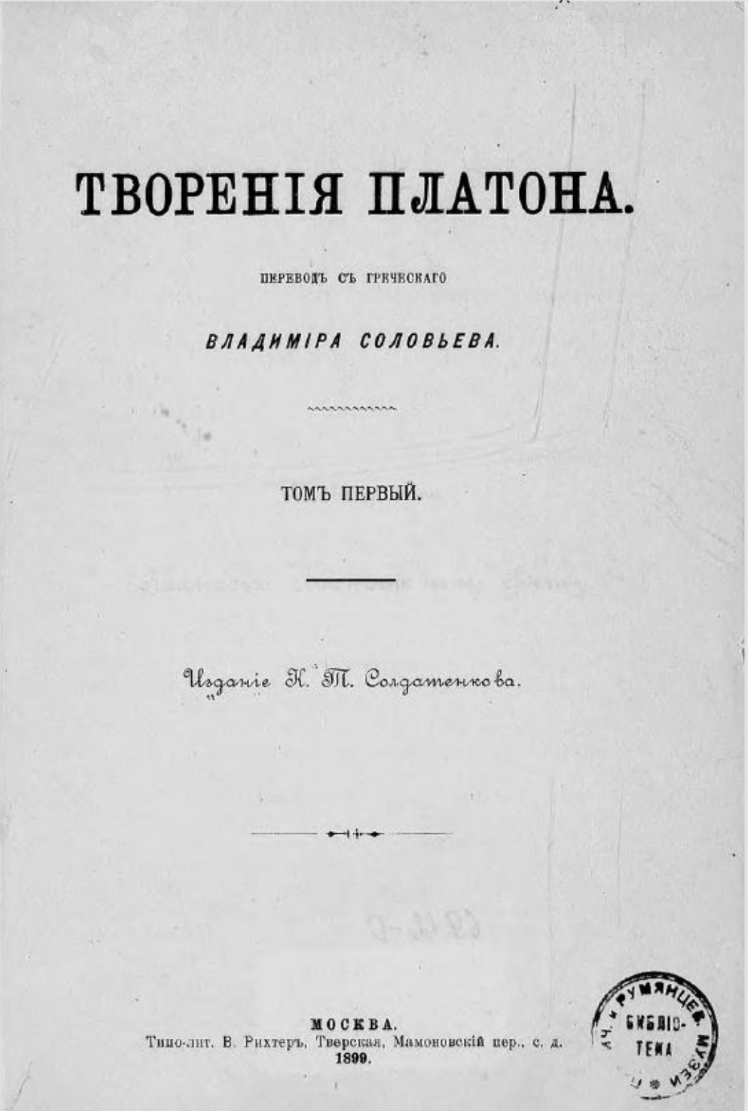 柏拉图的哲学思想传入俄罗斯已经有数百年历史,在俄罗斯收获了一大批崇拜者,也形成了独具特色的俄罗斯古典学流派。在俄罗斯,柏拉图变成了俄罗斯式的,索洛维约夫对柏拉图的解读就是最好的例证。▲ 索洛维约夫译《柏拉图文集》第一卷扉页,1899年