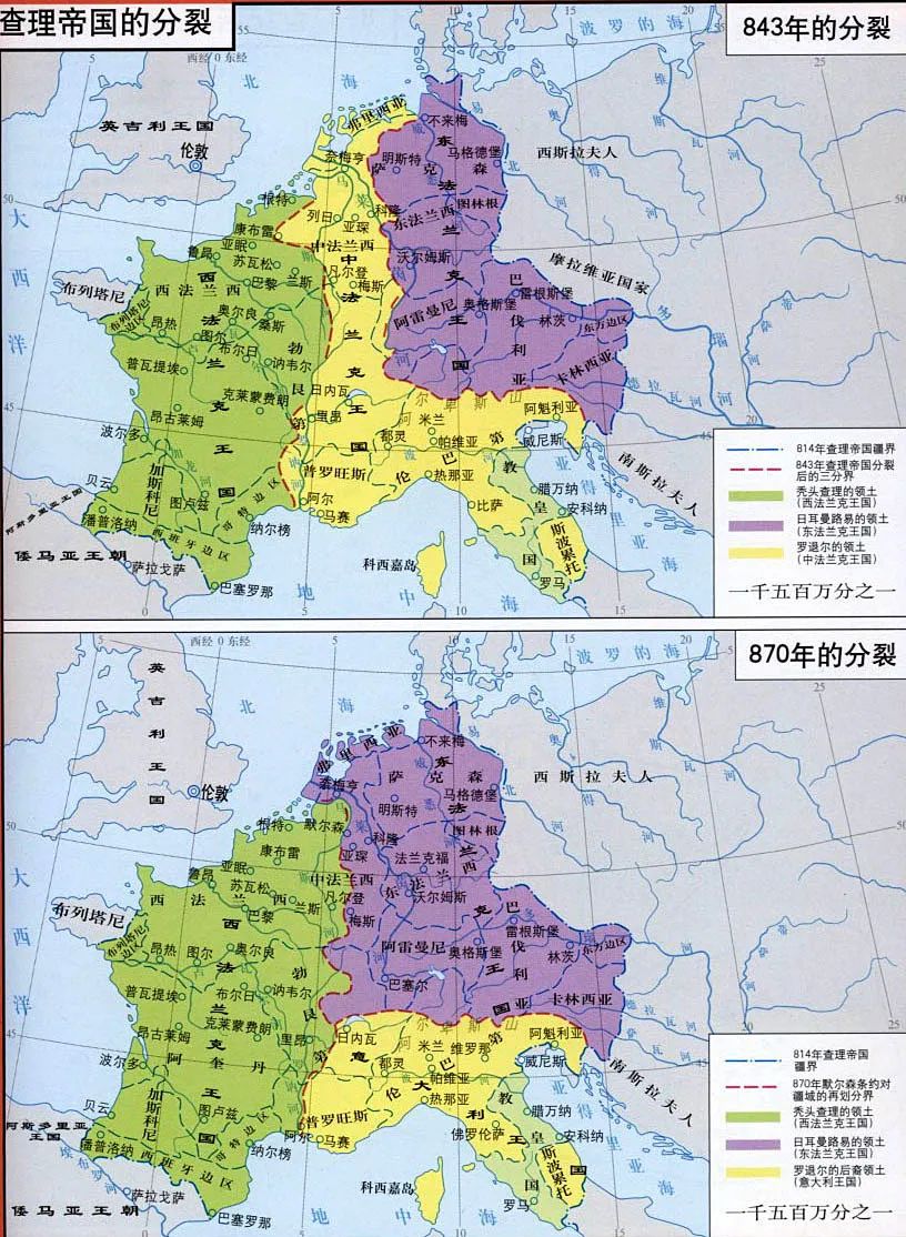 其实,20多年后(870),查理大帝的两个孙子在低地地区的墨尔森镇(Meersen)签订的条约,才实际确定法兰西与德意志的最初边界,而且仅仅是纸面上确立。虽然双方将些耳德河(Scheldt)、默兹河、索恩河(Saône)和罗讷河(Rhône)一线确认为分界线,但当地错综复杂的封建归属关系使得界线不可能完全清晰: