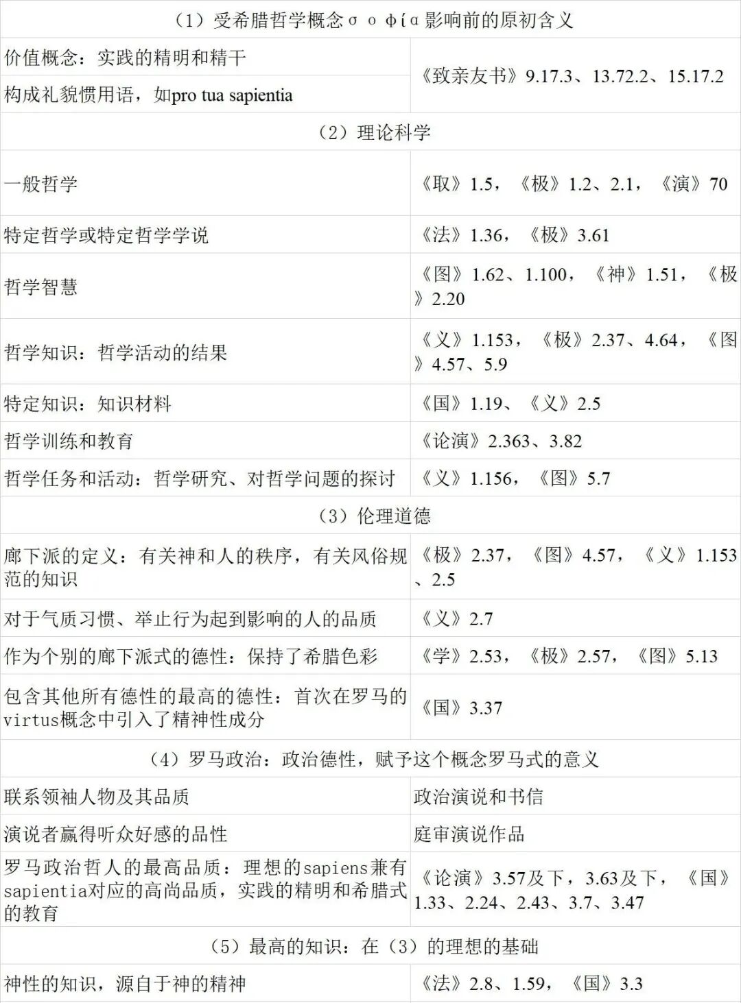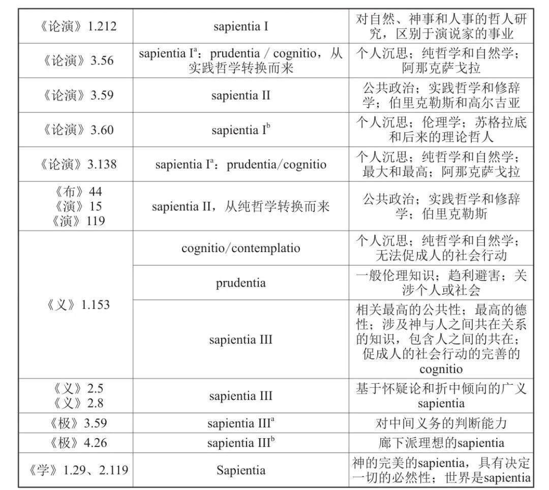 但是,霍迈耶尔自己也发现这两者实际上不可区分,因为在西塞罗那里,sapientia“这个词获得了极其丰富的含义”。对此,她有较为详尽的辨析,我们试用下表略作呈现。
