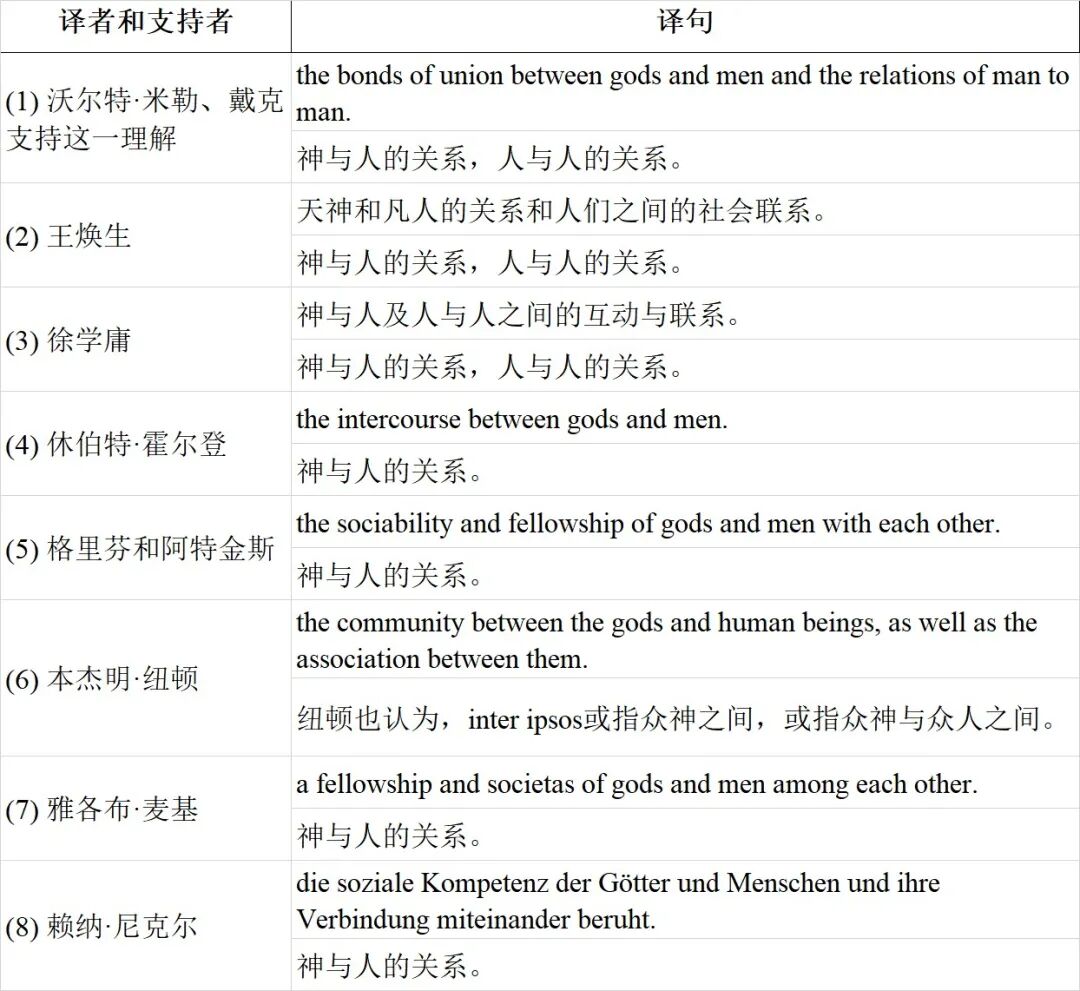这一段中“诸神与众人之间的共在和协作”(deorum et hominum communitas et societas inter ipsos)一句,学界有不同的断句和译法,而且有两种理解,这直接涉及到对西塞罗义务的阐释。下面简要列举一下: