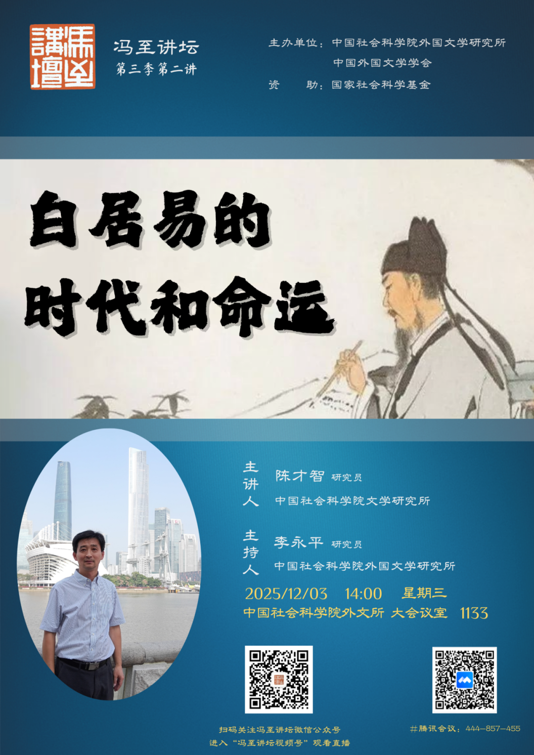 如会议室已满,请扫码关注微信公众号,进入“冯至讲坛”视频号观看直播。