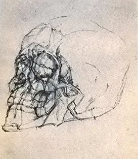 同为人体组成部分的骨头在贝克特的作品中也起到了和石头相似的作用。鉴于头颅本身就是骨头,骨头便经常与石头一样,构筑了“意识”寓居的小世界。例如在《马龙之死》中,马龙仿佛化身厄科,说道:“你会说,这一切只是在我的脑子里,我自己似乎也常常觉得我是在一个脑子里,我觉得,这八面,不,这六面围壁便是一副巨大的骨架。”[40] 这表明马龙似乎只是一个在小世界中游荡的“意识”。在《无法称呼的人》(L’Innommable)中,同样的表述再次出现:“有时我想我自己也在一个脑袋里,是恐惧让我这么说的,还有置身安全地方,四面八方被厚厚的骨头裹住的欲望。”[41] 这表明主人公所在的环境被剥夺了所有人类现实的细节,他仅困居于由头骨构成的小世界中。另外,如前所述,在《广播剧速写》里,未出生也不能死亡的双胞胎寓居在石头里,而在贝克特创作于1950年代后期的短篇小说《败笔3:远方一只鸟》(Au loin un oiseau)和《败笔4:出生前我已经放弃了》(“J’ai renoncé avant de naître”)中,同样有一个未出生也不能死亡的“我”停留在一个已经出生了的“他”体内,且这个“我”认为,“他”死后,“我”仍会一直寓居在骨头里:“我将渐渐知道,是他将死去,我么我不死,他将只剩下骨骸,我将在里面。”[42] 骨头在人死后可以继续长久地存在,人体在火化后变成碎骨头与骨灰存留于世。在此,骨头与石头一样,构筑了一个超越人类现实、时间与生死的小世界,非生非死的“我”作为一个非人“意识”以声音的形式飘散在其中。