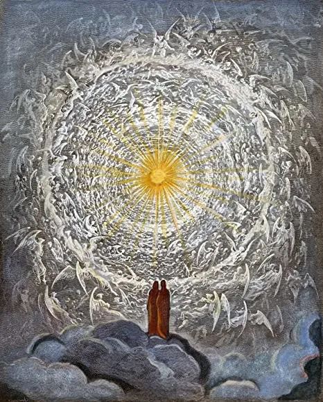 此外,但丁还在《神曲》中化用了维吉尔史诗描绘的金枝,表明炼狱也是维吉尔的描述对象。在维吉尔史诗的第六卷中,埃涅阿斯先是经过无罪或罪行较轻者居住的“哀悼之野”(lugentes campi),然后又听西比拉列举地狱城内在塔塔鲁斯中遭到惩罚的各种重罪,随后,在去往埃吕西姆之前,埃涅阿斯将金枝放在地狱城墙脚下,奉献给普洛塞尔皮娜,并为此举办了一个净化仪式(详见《埃》:VI.441-451)。这个情节在《炼狱》篇第一曲中得到了强调:在开始攀登炼狱山之前,但丁由维吉尔洗净脸庞并佩戴上海边的芦苇(详见《炼》:I.121-136)。两个文本最明显的共同之处是芦苇和金枝都在拔出后立刻重生。[68] 金枝的仪式标志着埃涅阿斯整个地府之旅的中点,这意味着在《炼狱》篇开头处,但丁刚把《埃涅阿斯纪》第六卷“读”到一半。此外,但丁对伊甸园描写的关键之处也来自维吉尔的作品,比如他将埃吕西姆中的忘川放置在自己所描绘的伊甸园中(详见《炼》:XXVIII.130-132)。更重要的是,但丁对天堂的描写也脱胎自维吉尔的冥界图景。维吉尔借助一个比喻来描写将要投生的灵魂围绕忘川飞舞的景象:“就像在一片草地上,蜜蜂在晴朗春日/进驻五颜六色的花,或围绕着雪白的/百合散开,整个田野嗡嗡作响。”(《埃》:VI.707-709)在《天堂》篇中,当但丁升入净火天即真正的天堂后,最初呈现在他眼前的东西仿佛正是维吉尔的忘川[69]: