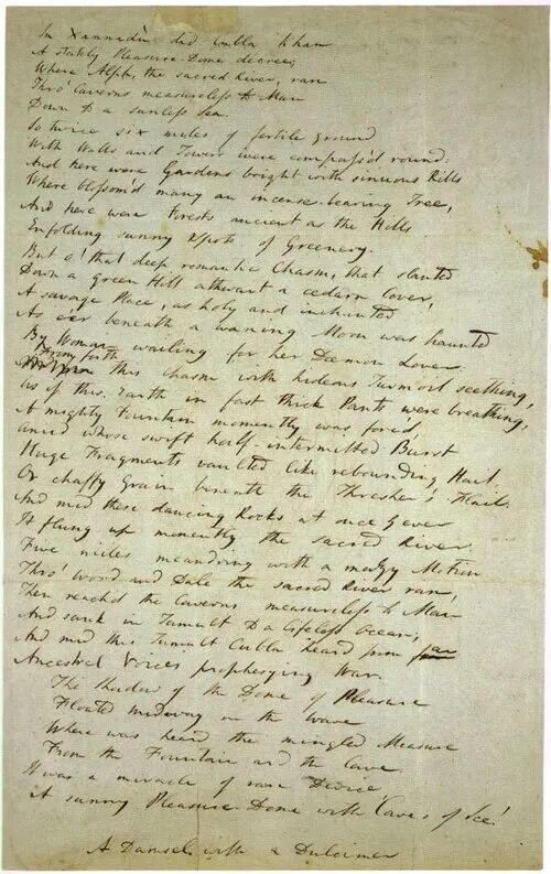 这一段文字极富传奇色彩,常被人征引,但未必可信,最有力的质疑来自诗人早年的一份亲笔手稿,即“克鲁手稿”。在这份手稿的末尾有一则简短的附言:“此断章之外的众多诗行不可恢复,作于神思恍惚之时,时为疟疾所苦,饮鸦片酊两滴,于珀洛克村和林顿村的一处农舍,距库尔伯恩教堂1/4英里,1797年秋——柯勒律治。”从句法上讲,这并不是一个完整连贯的句子,仅仅是一些语词的即兴连接,没有关联词。跟序言中对创作始末的繁复描写(近乎渲染)相比,此附言显得过于简洁,甚至干瘪,但却可能更接近真相,因为附言读上去像是个人备忘录,意不在出版。两相比较,相异之处甚多。